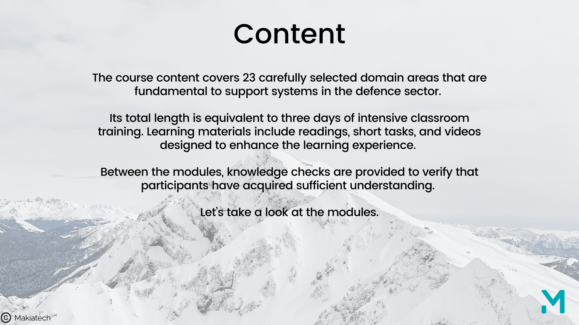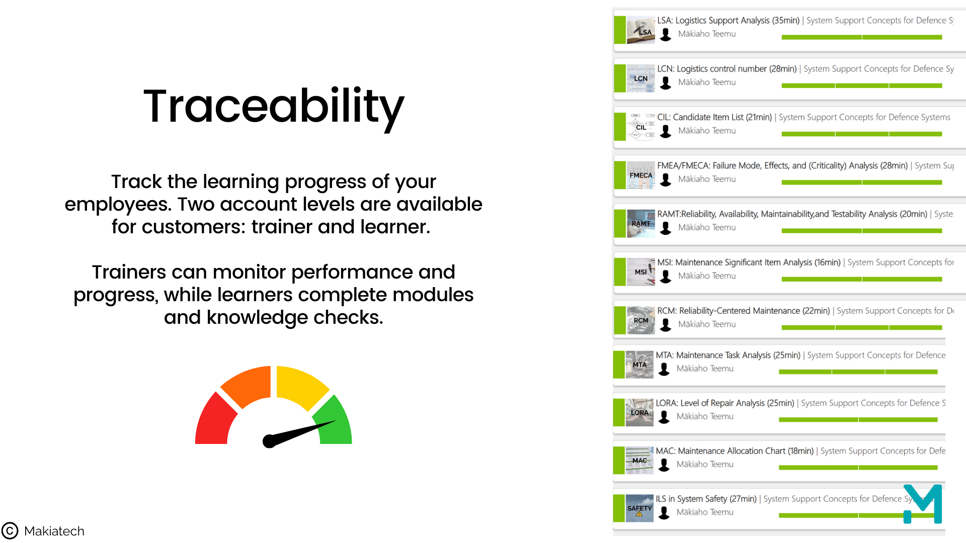 The “System Support Concept for Defence Systems” course is the first full program published in the Makiatech LMS platform. It gives participants the ability to understand, design, and manage support solutions that meet the demanding requirements of defence projects.